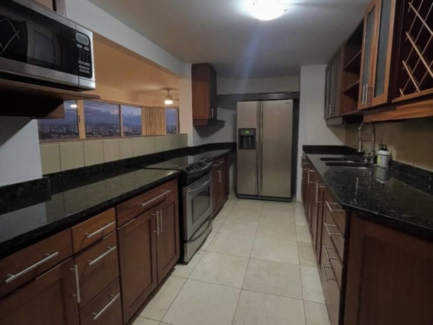 Cuenta con 3 habitaciones y 2 baños. Cocina completamente equipada con estufa con horno, horno microondas y nevera. Unidades de aire en cada cuarto, lavadora, secadora y calentador de agua de línea. Master room con amplio closet. Ventanal en la sala con lindas vistas a la ciudad. Balcón. Área de parque pasivo. Seguridad. Estacionamiento bajo techo. Renta de $2,800 mensuales (incluye agua).