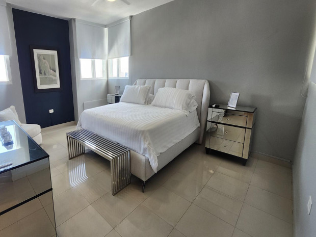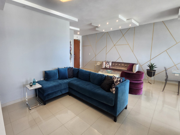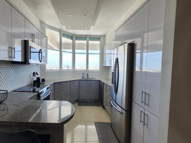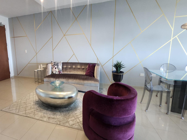 Elegante apartamento completamente amueblado y decorado por diseñador, con amplios y luminosos espacios abiertos. Cuenta con sala formal con recibidor, área de comedor, y un acogedor family